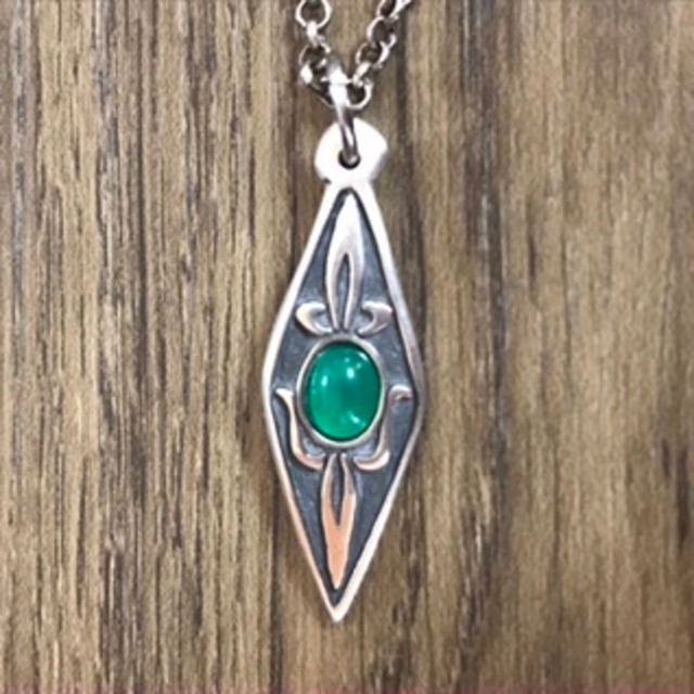 菱形シールド型デザインのペンダントトップです。 使用した天然石はグリーンカルセドニー。 ハッキリとした鮮やかな緑色が特徴的な石です。 繁栄と栄光を象徴するパワーストーンです。 ペンダントのサイズは、全長4.4cm×1.5cmです。 シルバー925製です。 画像に添付してある鎖はオマケでついてきます、55センチのステンレス製になります。 (こちらは、セミオーダー品となりますので、注文いただいてから製作しての販売となりますので、一週間ほどお時間いただけると幸いです。)