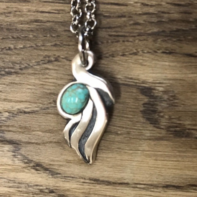 水の羽をデザインしたペンダントトップに、使用した天然石は、アマゾナイト。 グリーンと青の中間色の様な癒し効果の石です。 素材はsilver925です。 サイズは全長3.8センチ×1.3センチです。 (鎖はオマケで付けますが、少し長めの55センチのステンレス製です。)